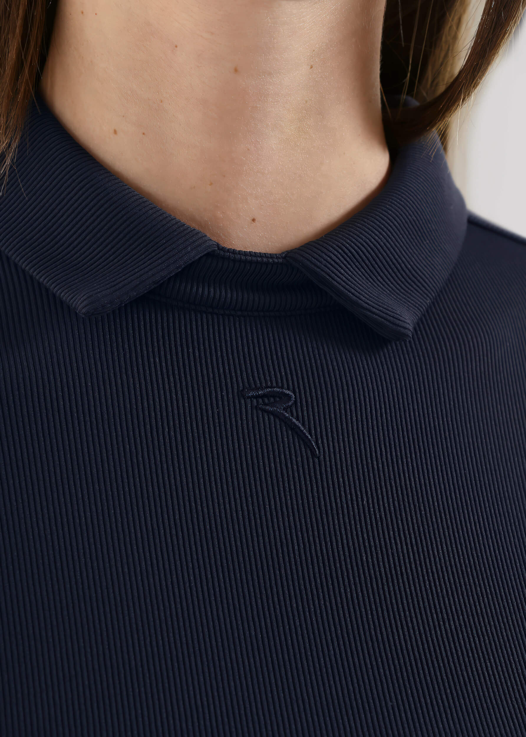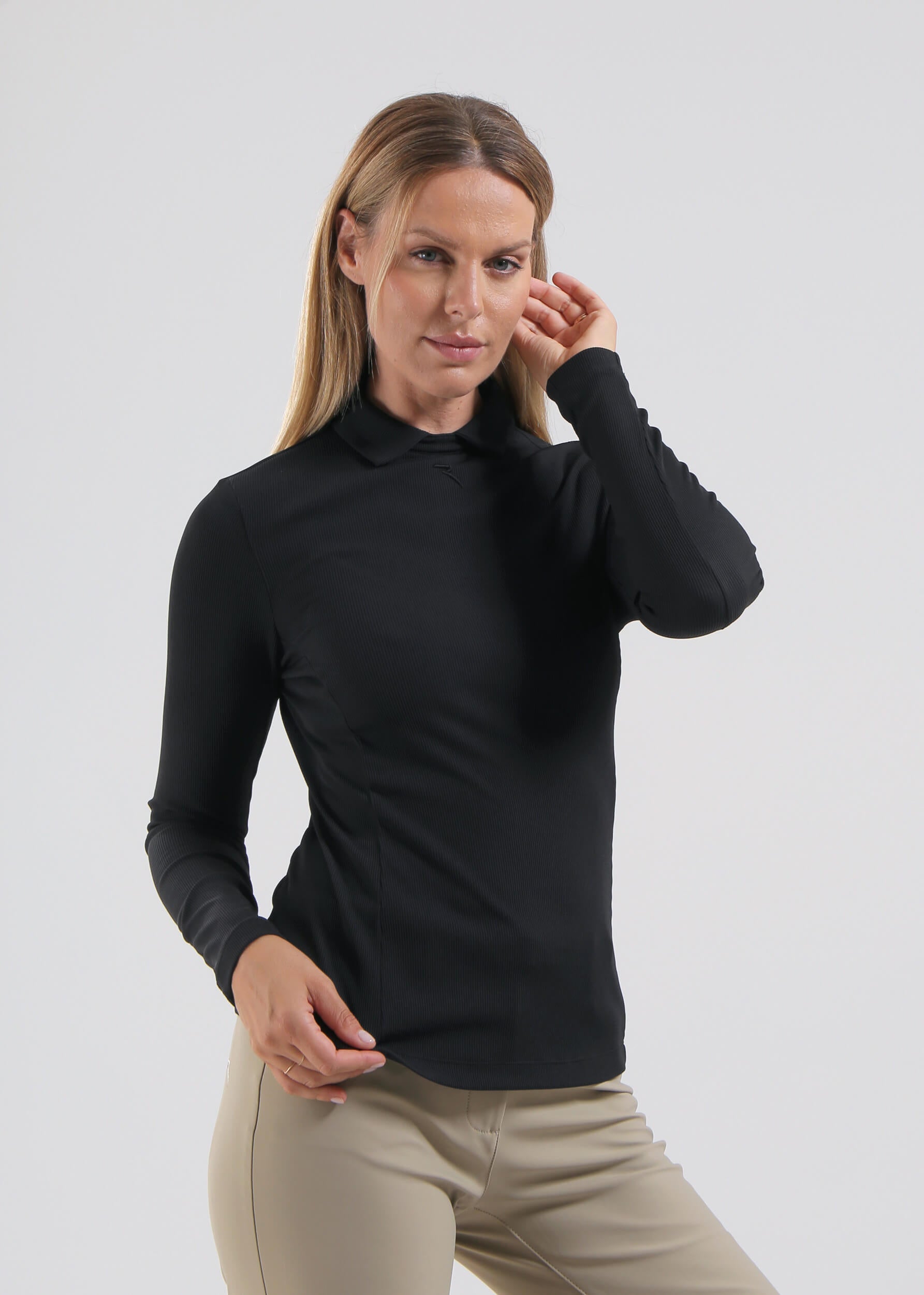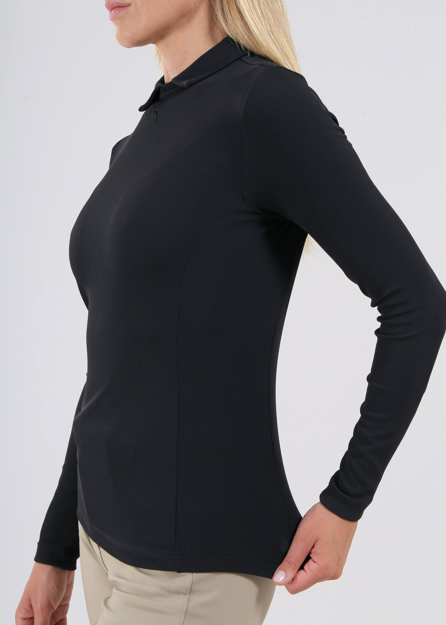 ANTAGONISTA  is a long-sleeve polo crafted from ribbed Pro-Therm® stretch fabric with a lightly brushed interior for warmth and comfort. A tonal logo at the chest and a sleek back zip create a clean, modern aesthetic — a sophisticated base layer to open the season in style.