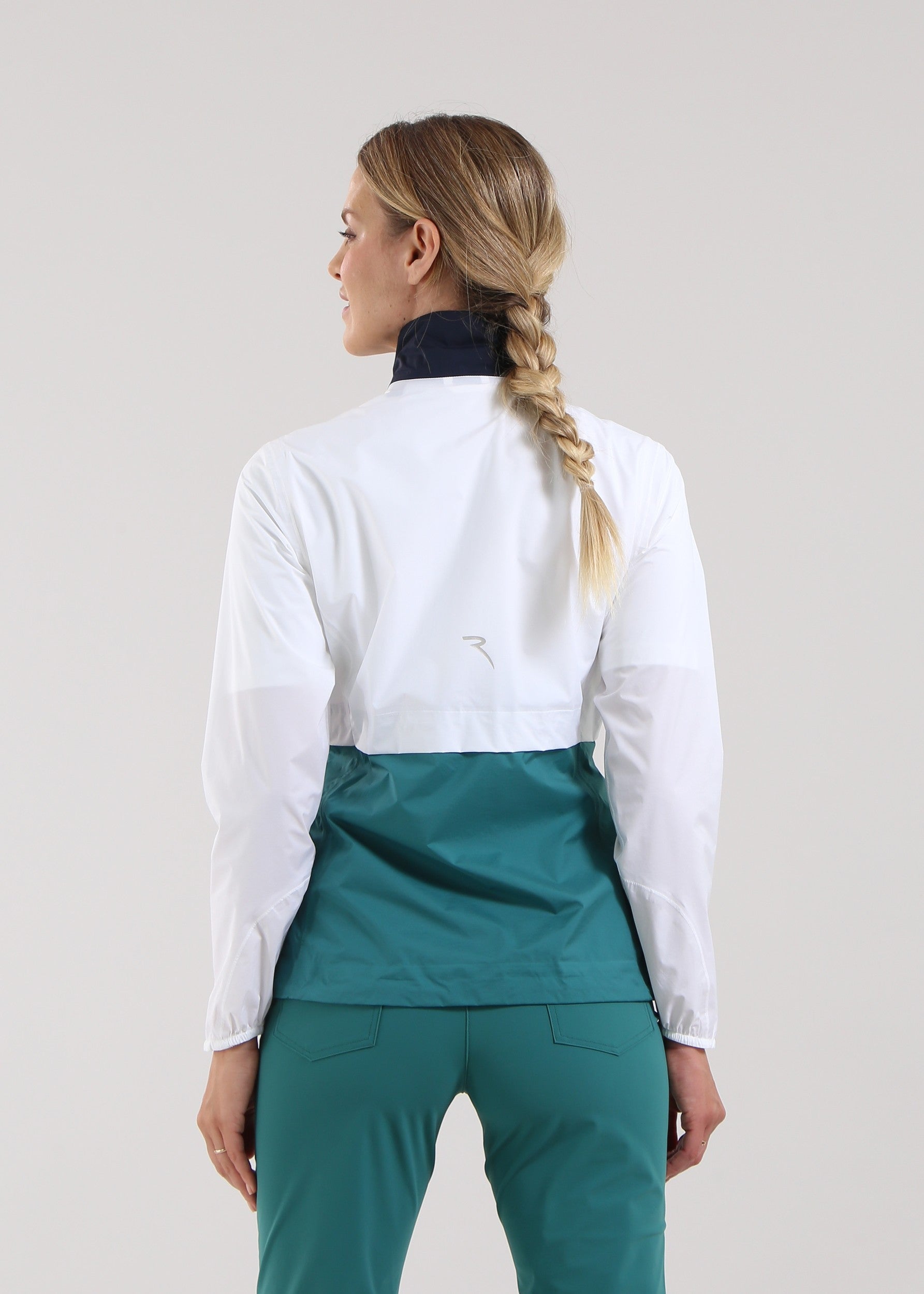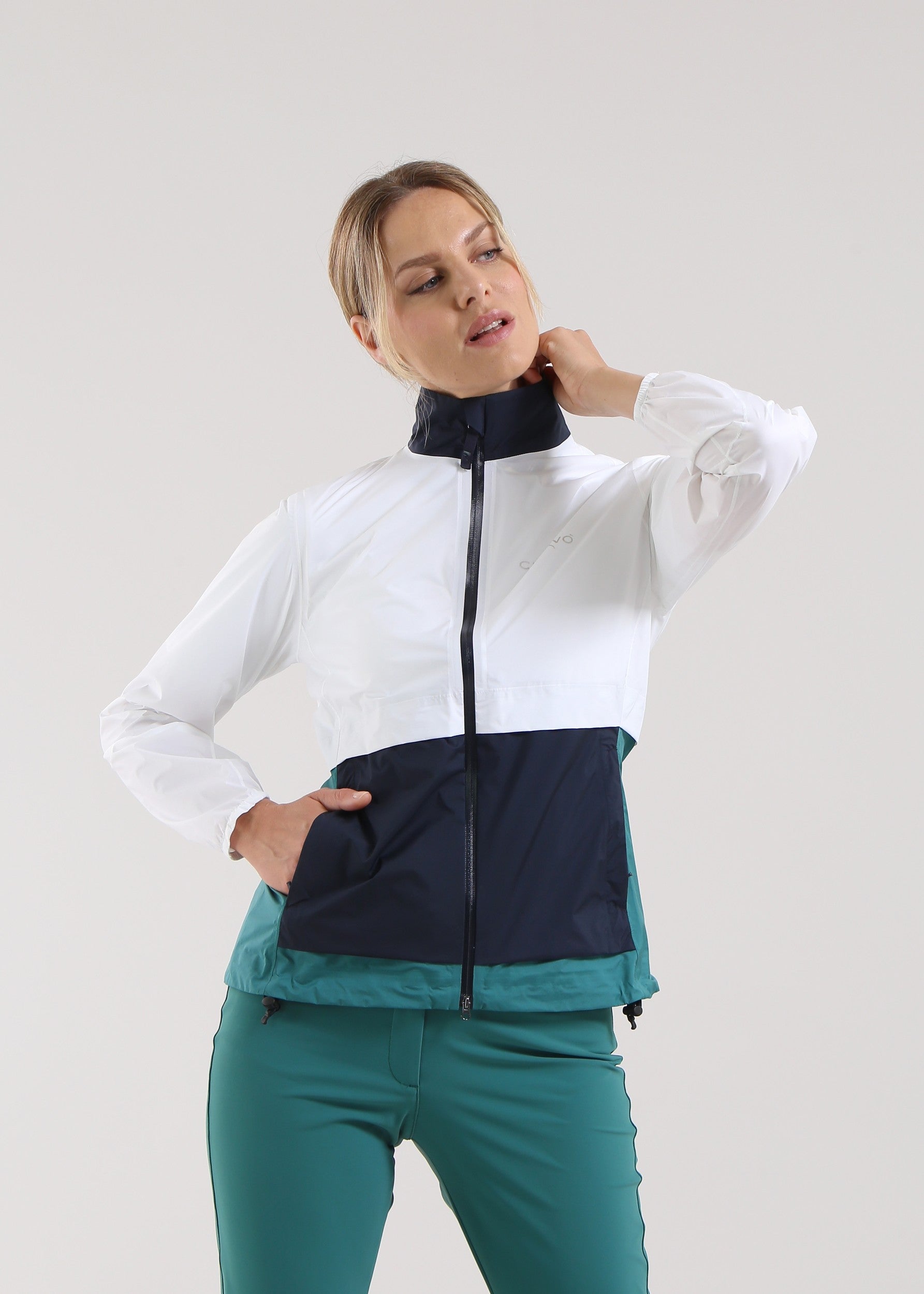 MARTA is a women’s waterproof and windproof golf jacket made from two-layer Aqua-Block® fabric, designed for lightweight protection and freedom of movement. The ultra-thin 7-micron membrane provides excellent waterproofing and breathability, while taped seams, zip pockets, a two-way front zipper, and an adjustable drawcord complete a clean, sporty design built for play in any weather.