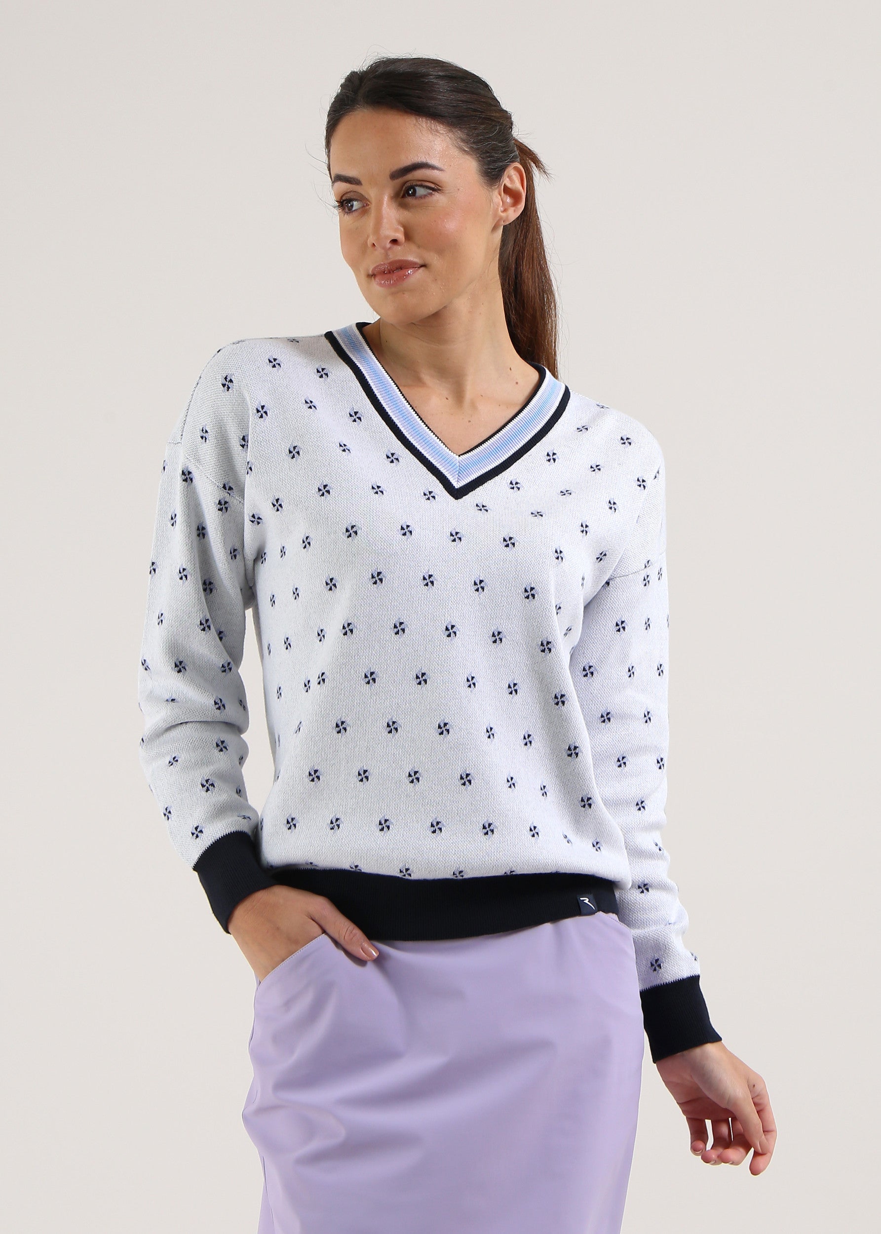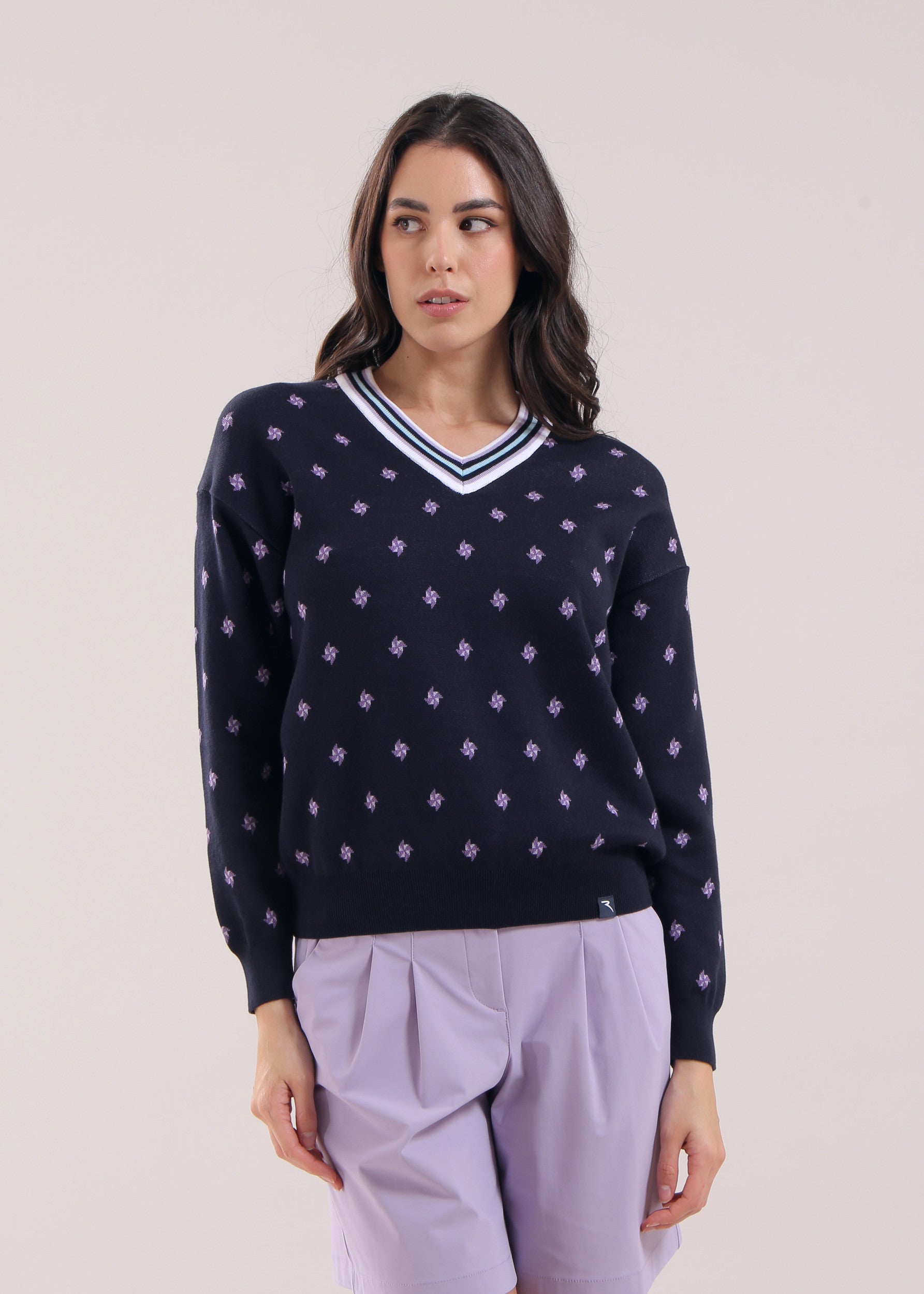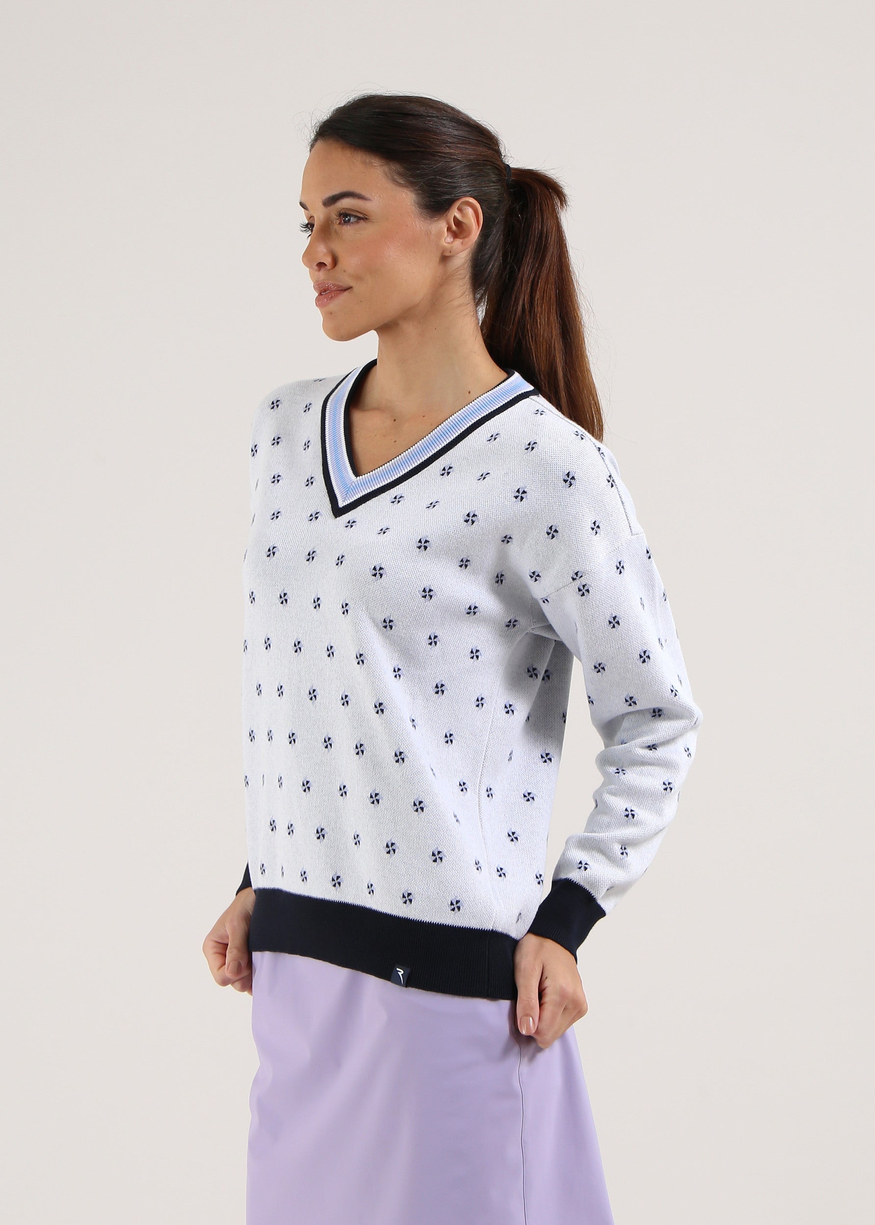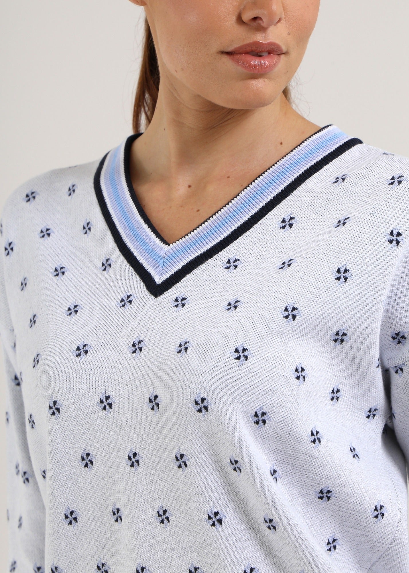 NOTIZIA is a high-quality cotton pullover featuring a refined jacquard micro-pattern inspired by the classic pinwheel motif.