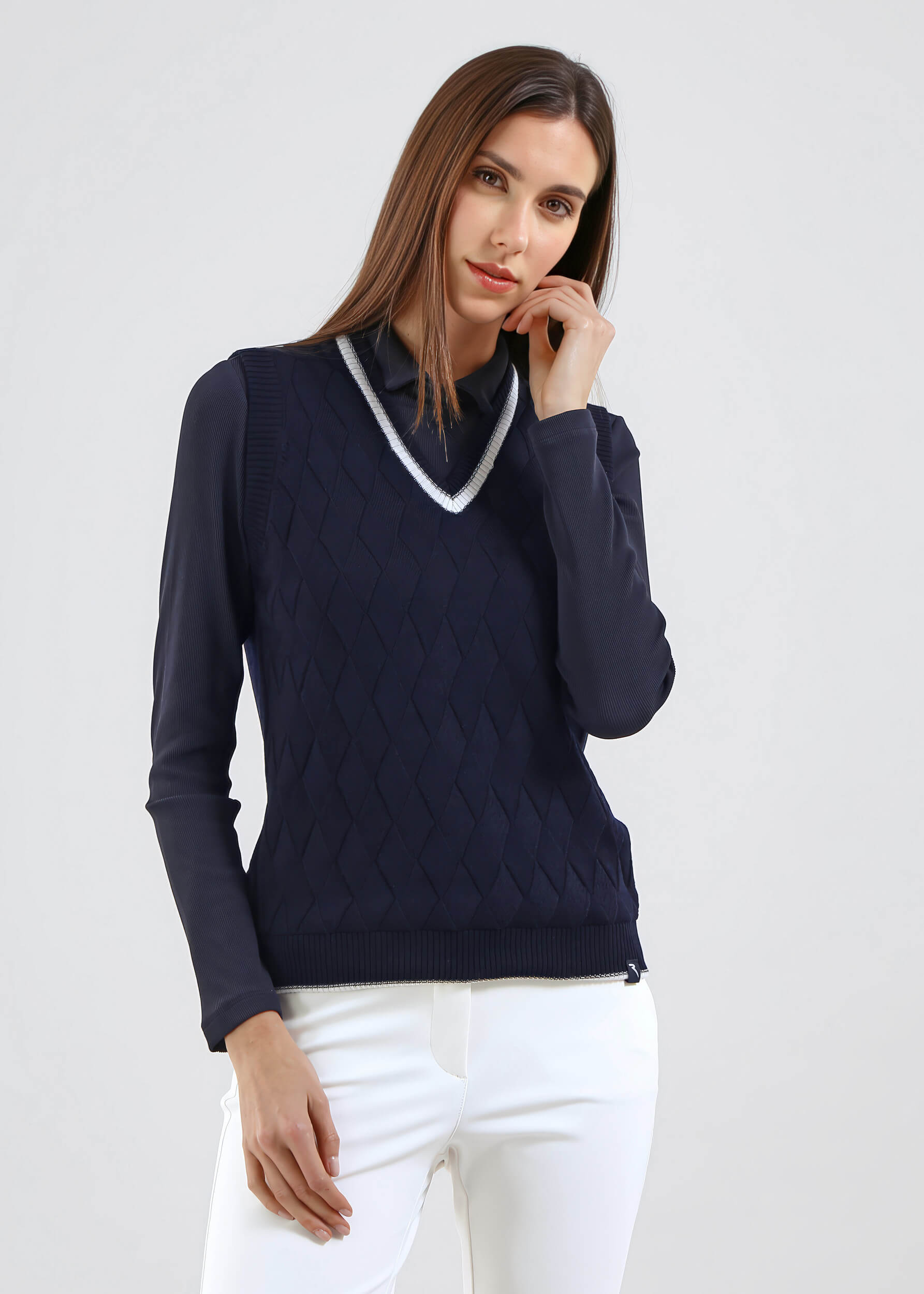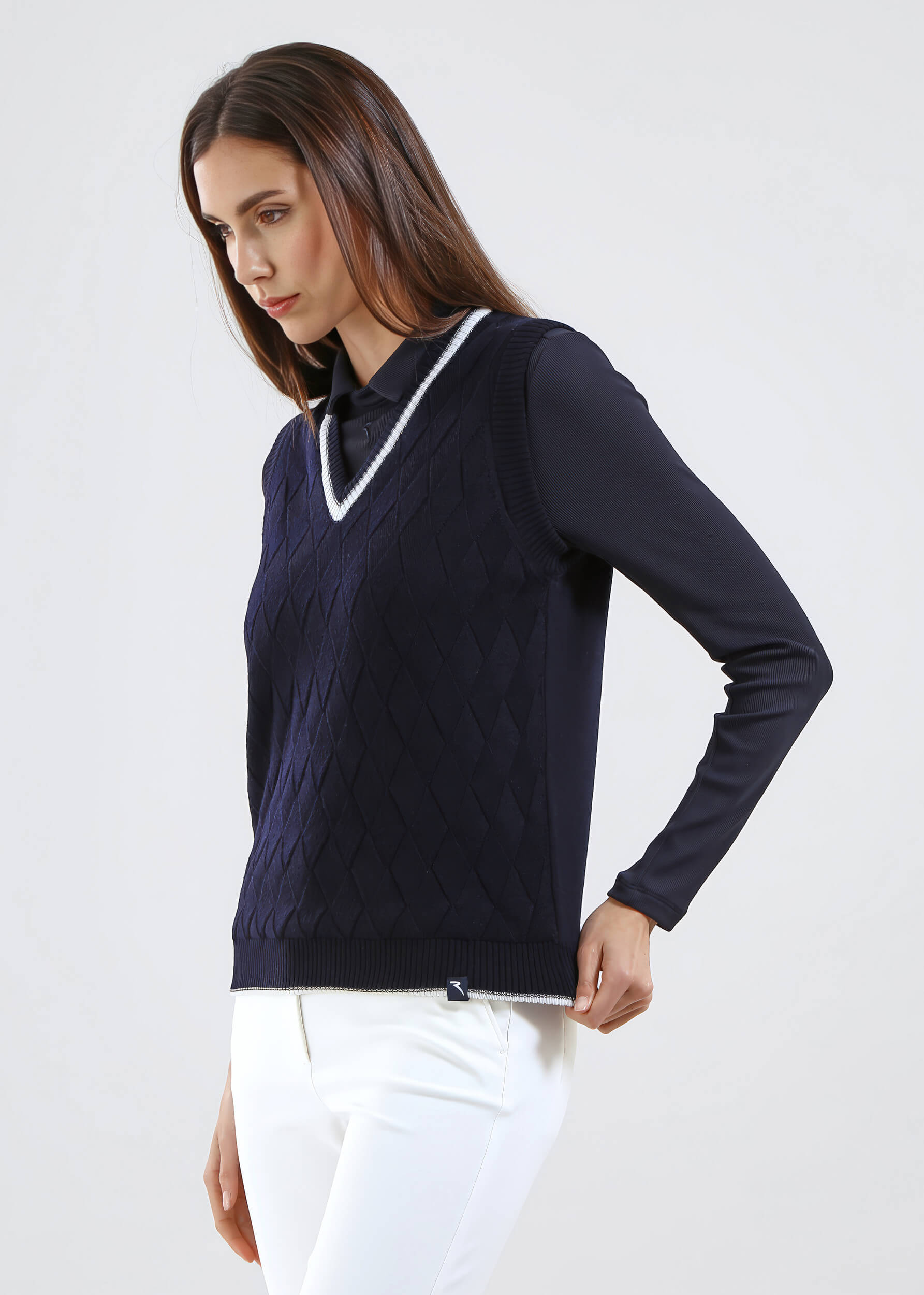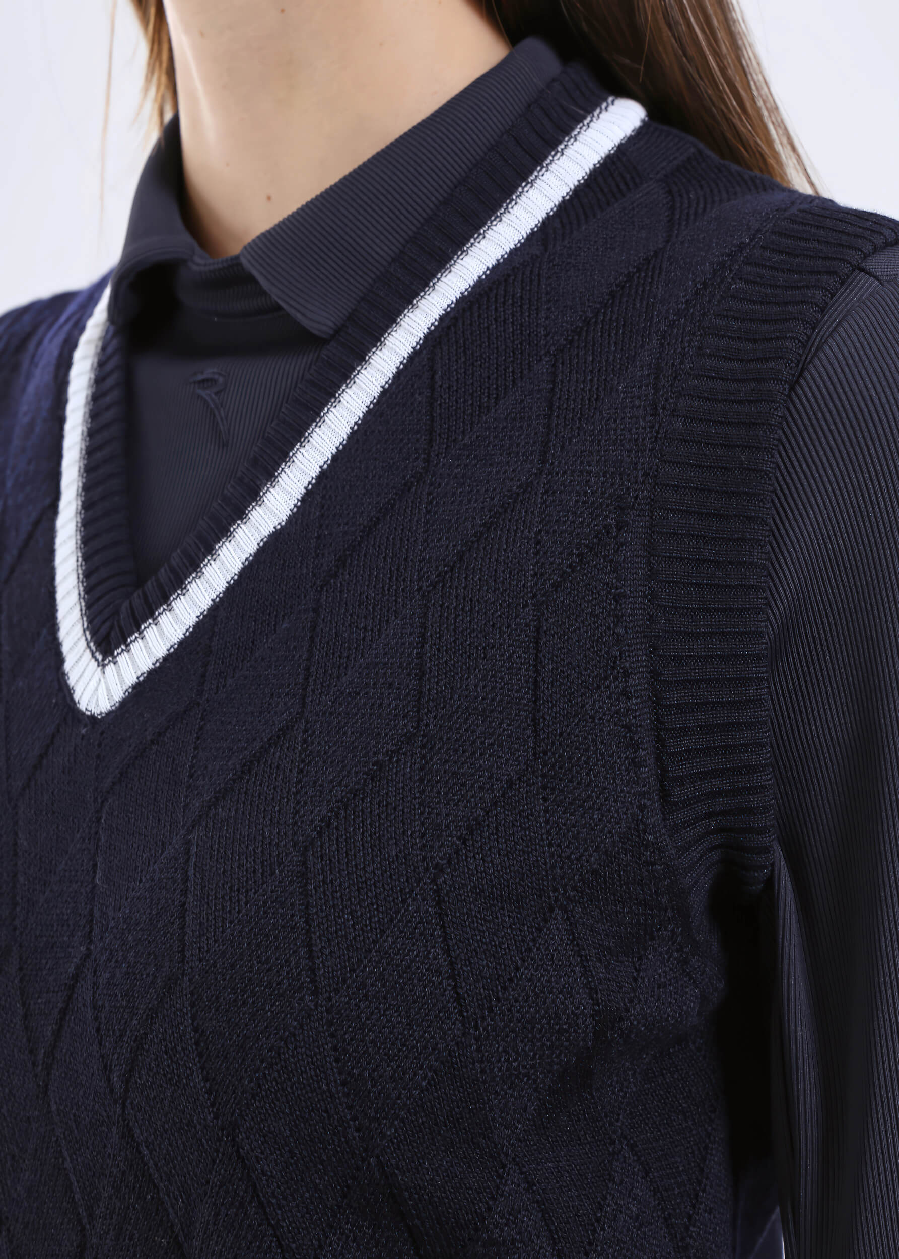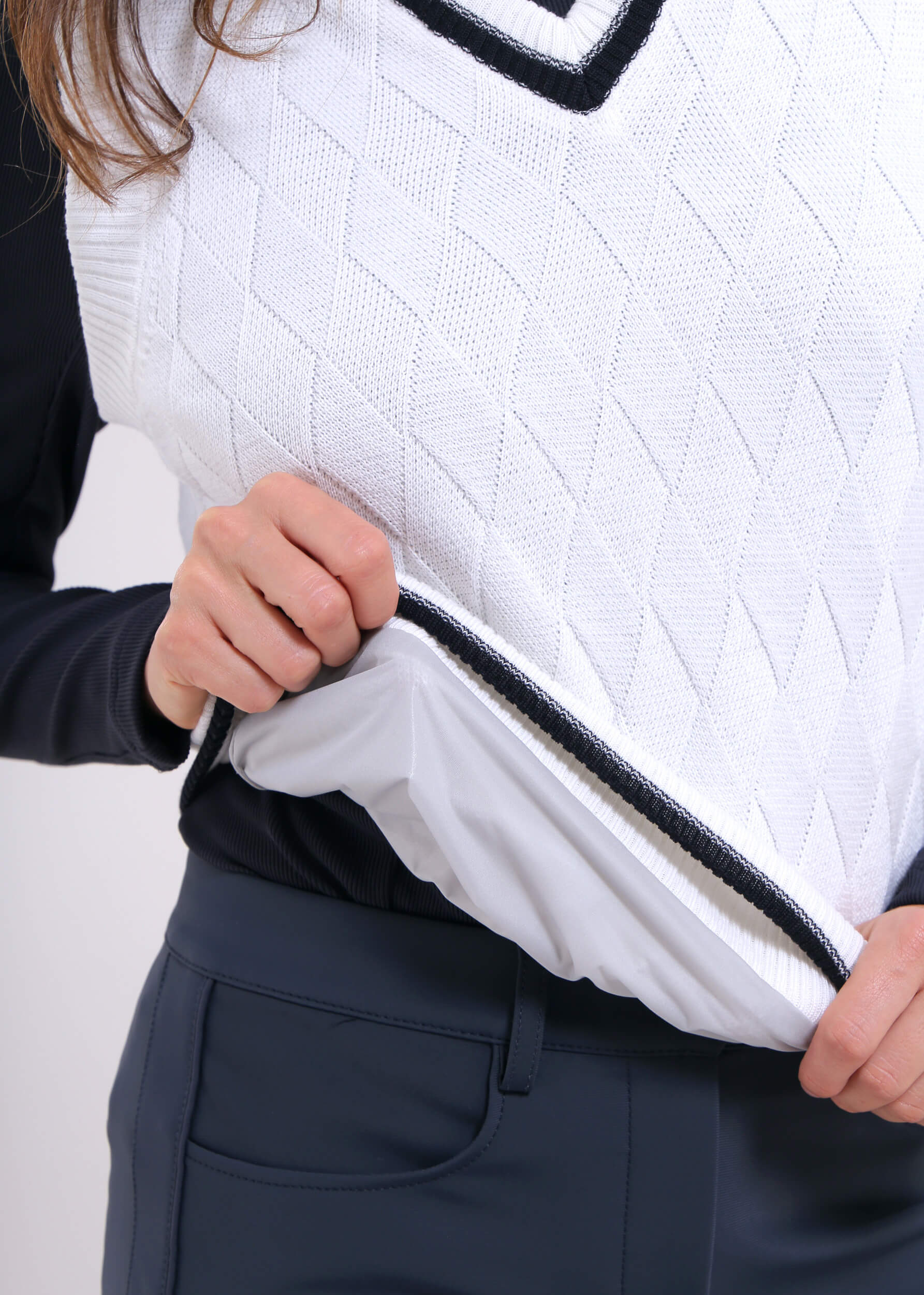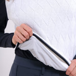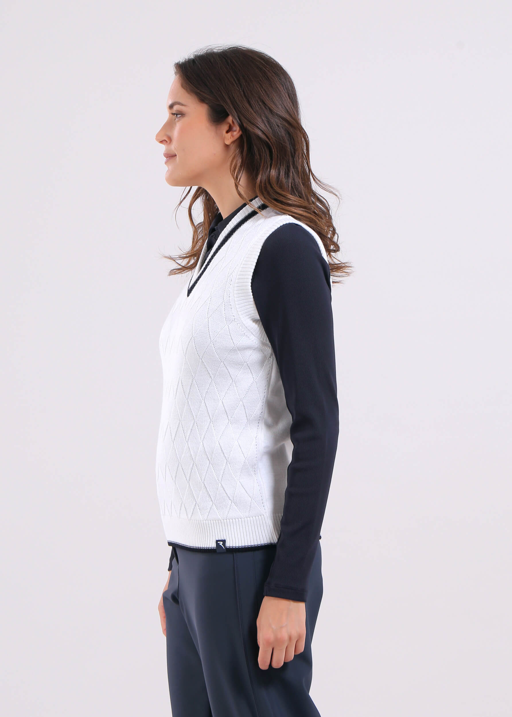 NOVIZIA is a hybrid vest in soft merino wool with a windproof lining for added protection. The diamond jacquard knit creates a subtle graphic effect, elevated by contrast trim and a chest pocket. A refined layering piece for colder days.