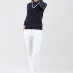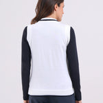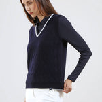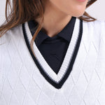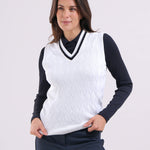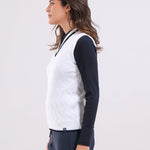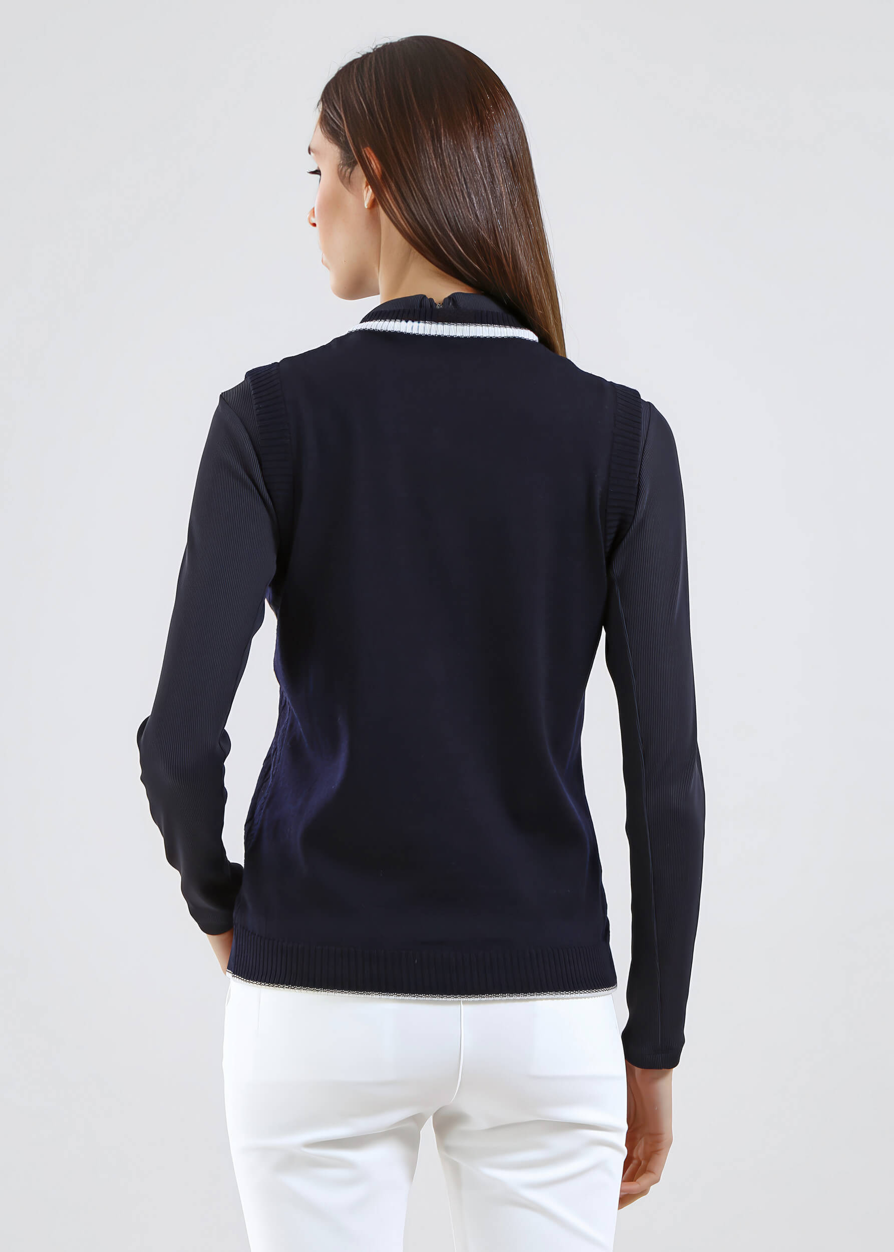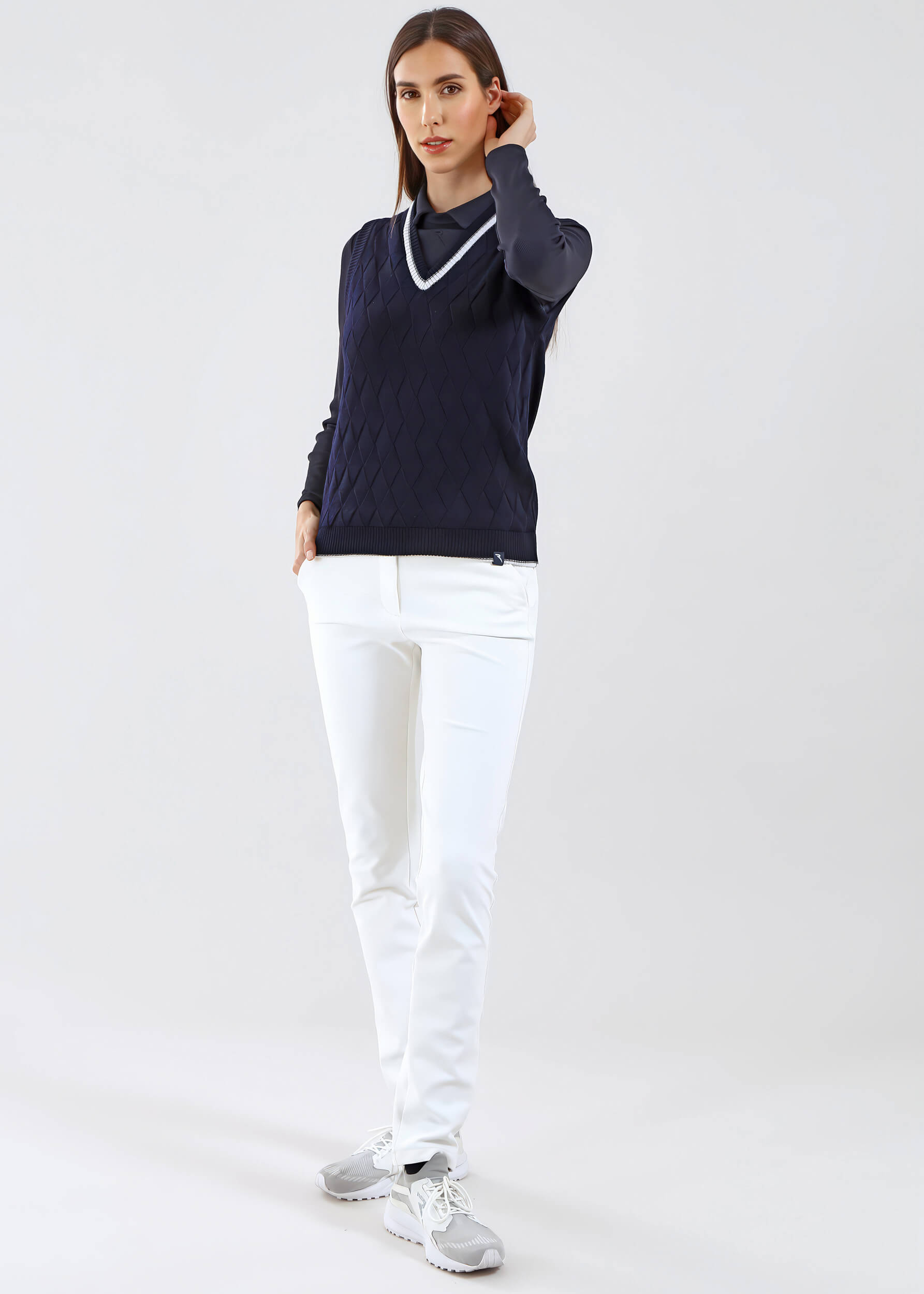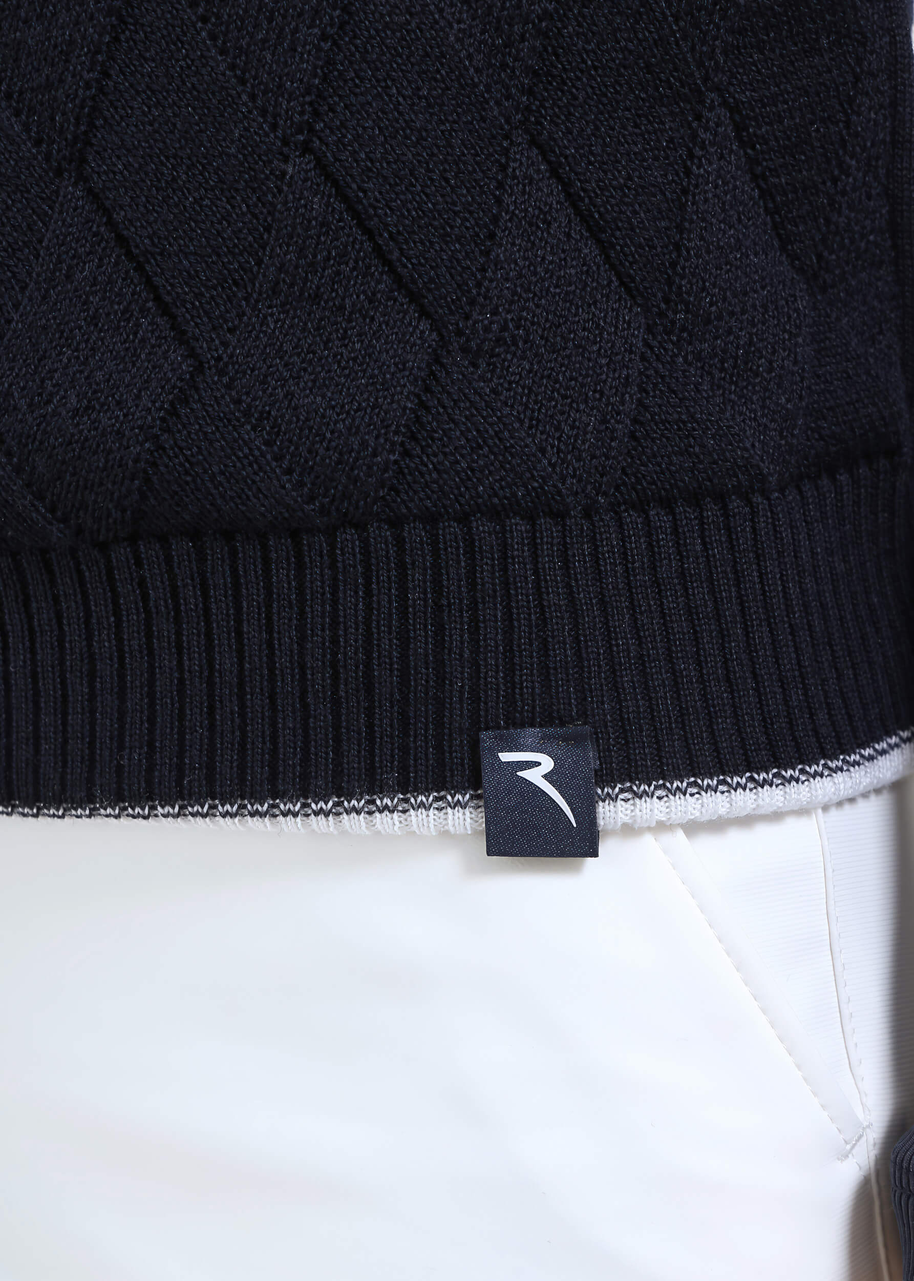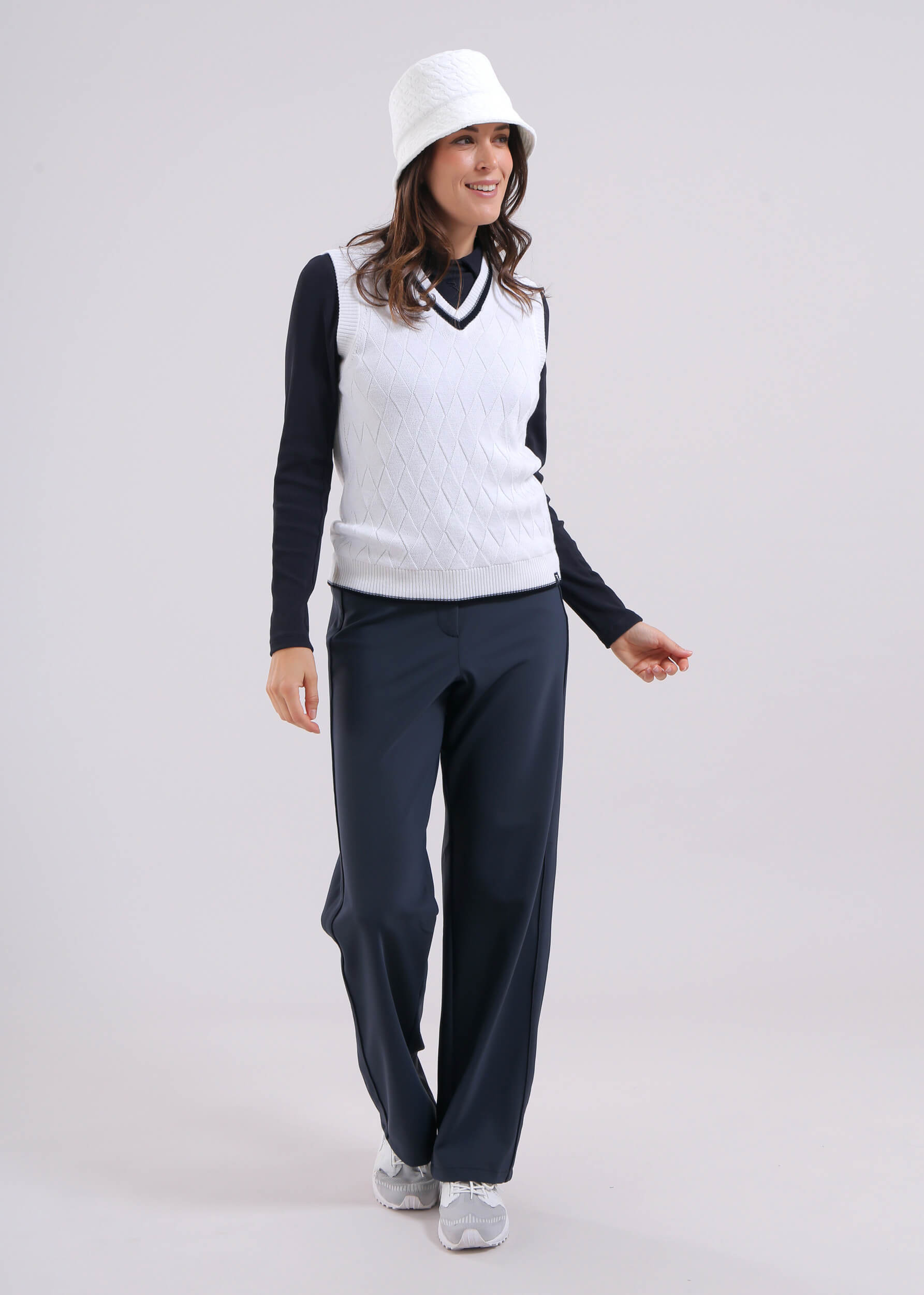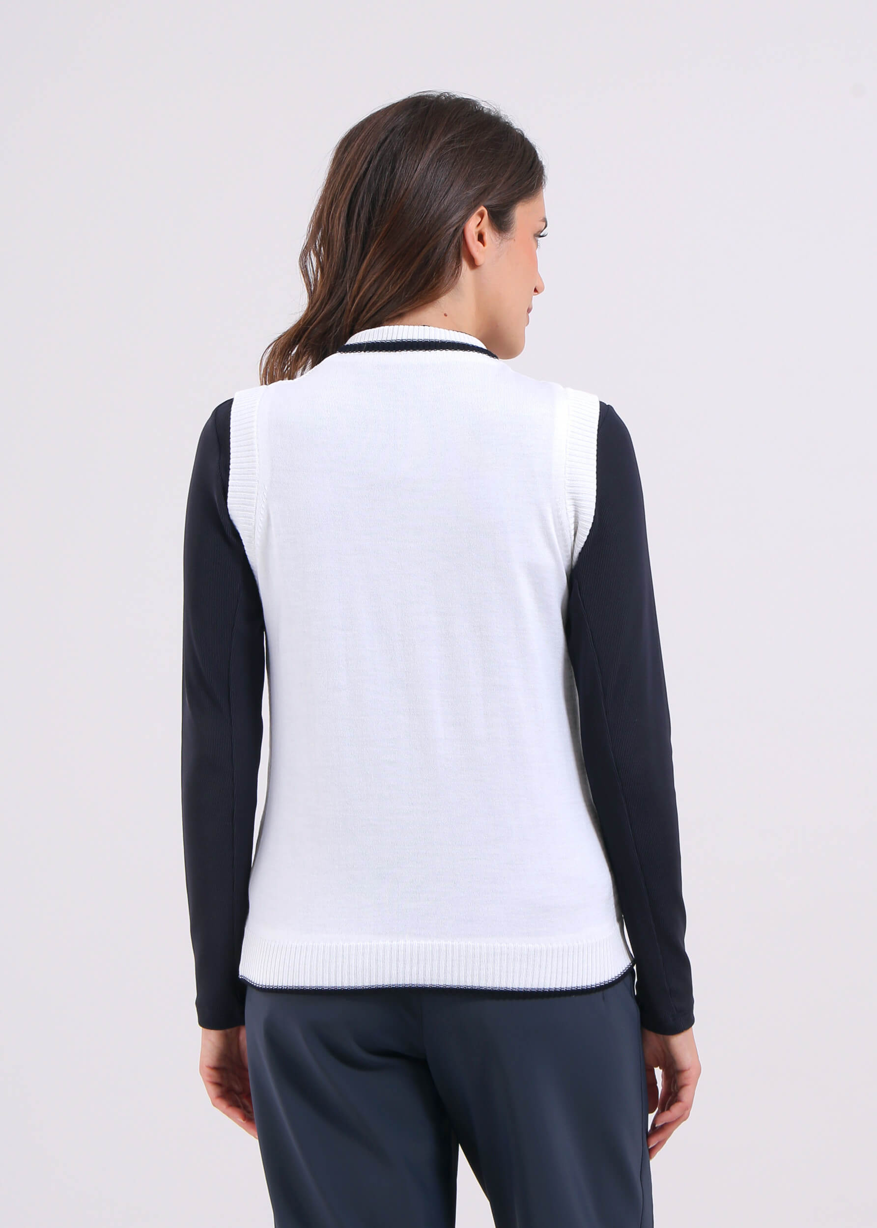 NOVIZIA is a hybrid vest in soft merino wool with a windproof lining for added protection. The diamond jacquard knit creates a subtle graphic effect, elevated by contrast trim and a chest pocket. A refined layering piece for colder days.