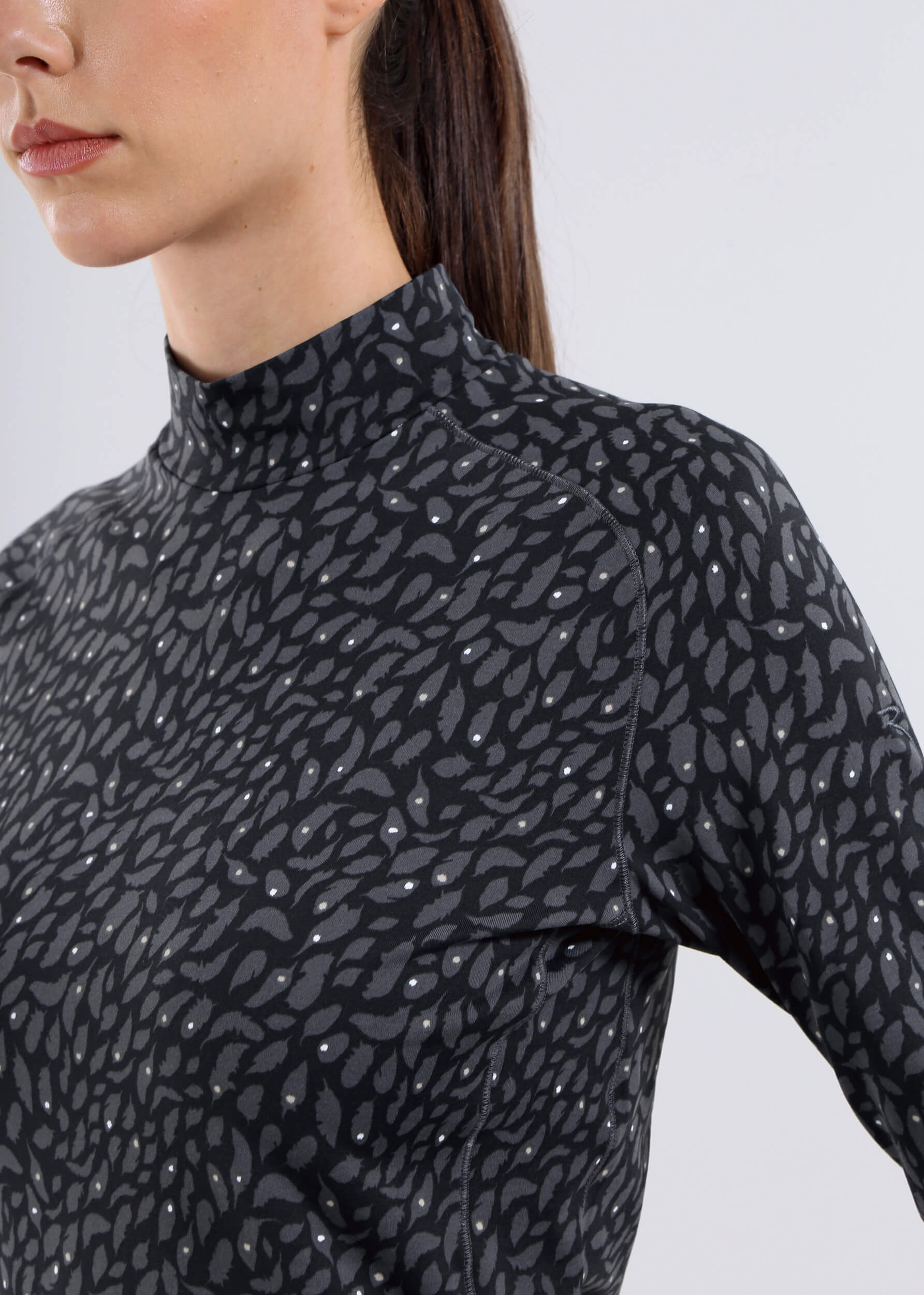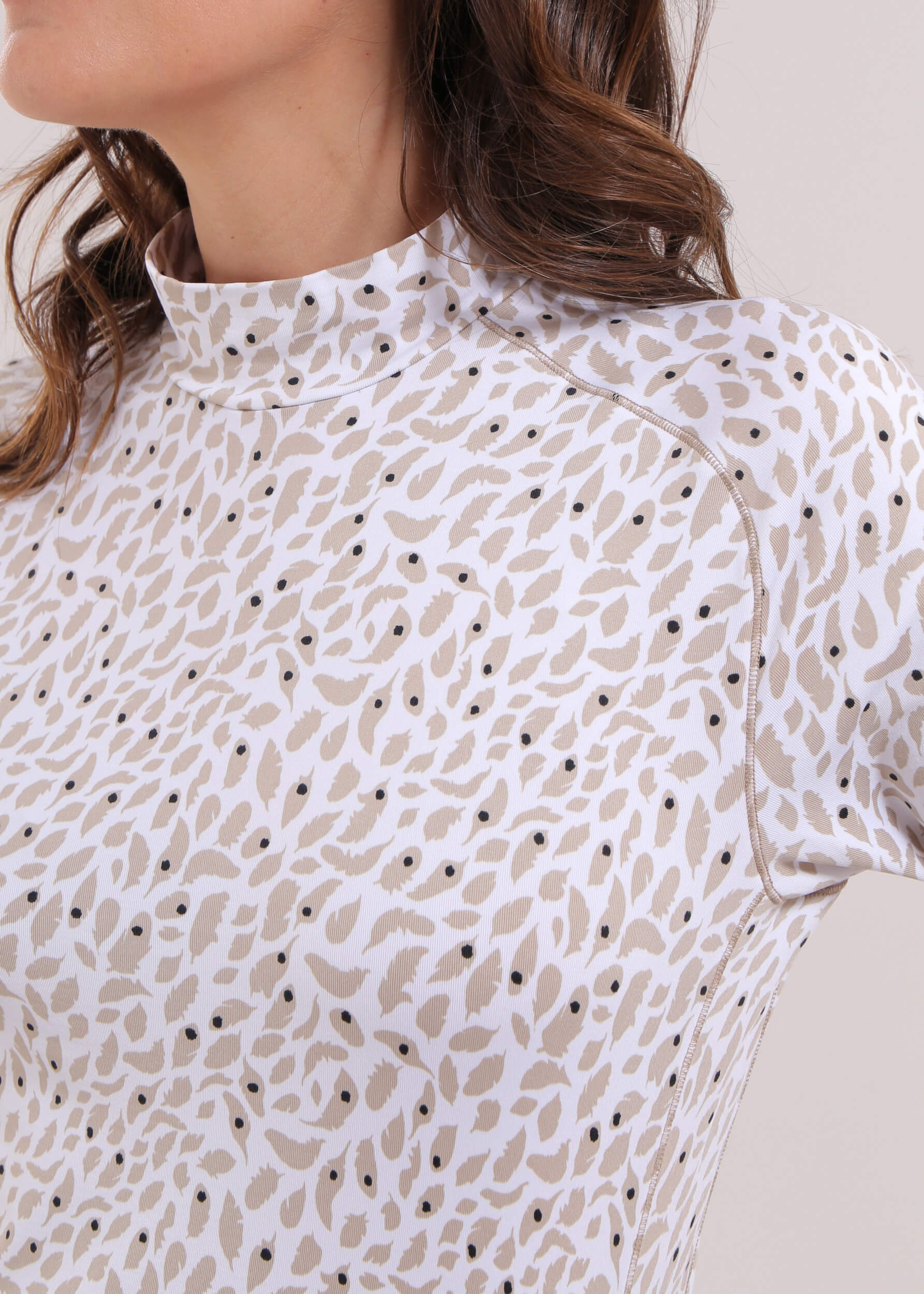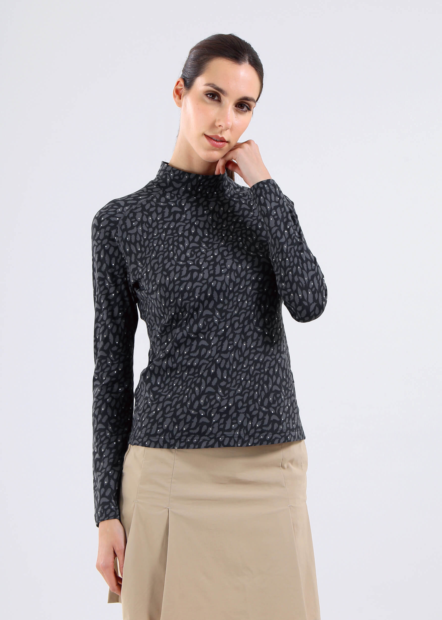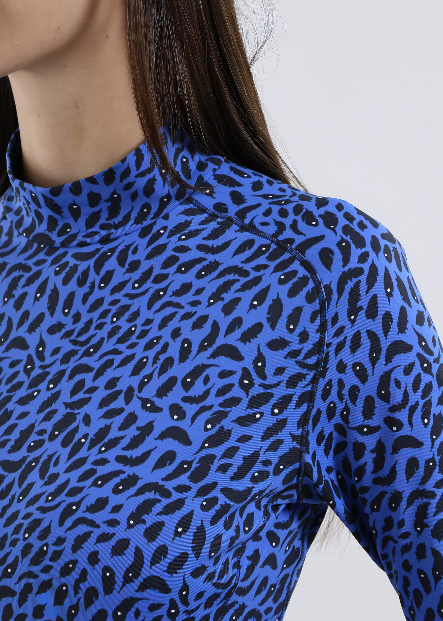 TANIA is a turtleneck sweater in brushed jersey, designed to be worn as a first layer. The all-over “Pois Feather” print adds a bold graphic touch. Stretchy and warm, it is the essential base layer to face the cold season with sporty style