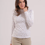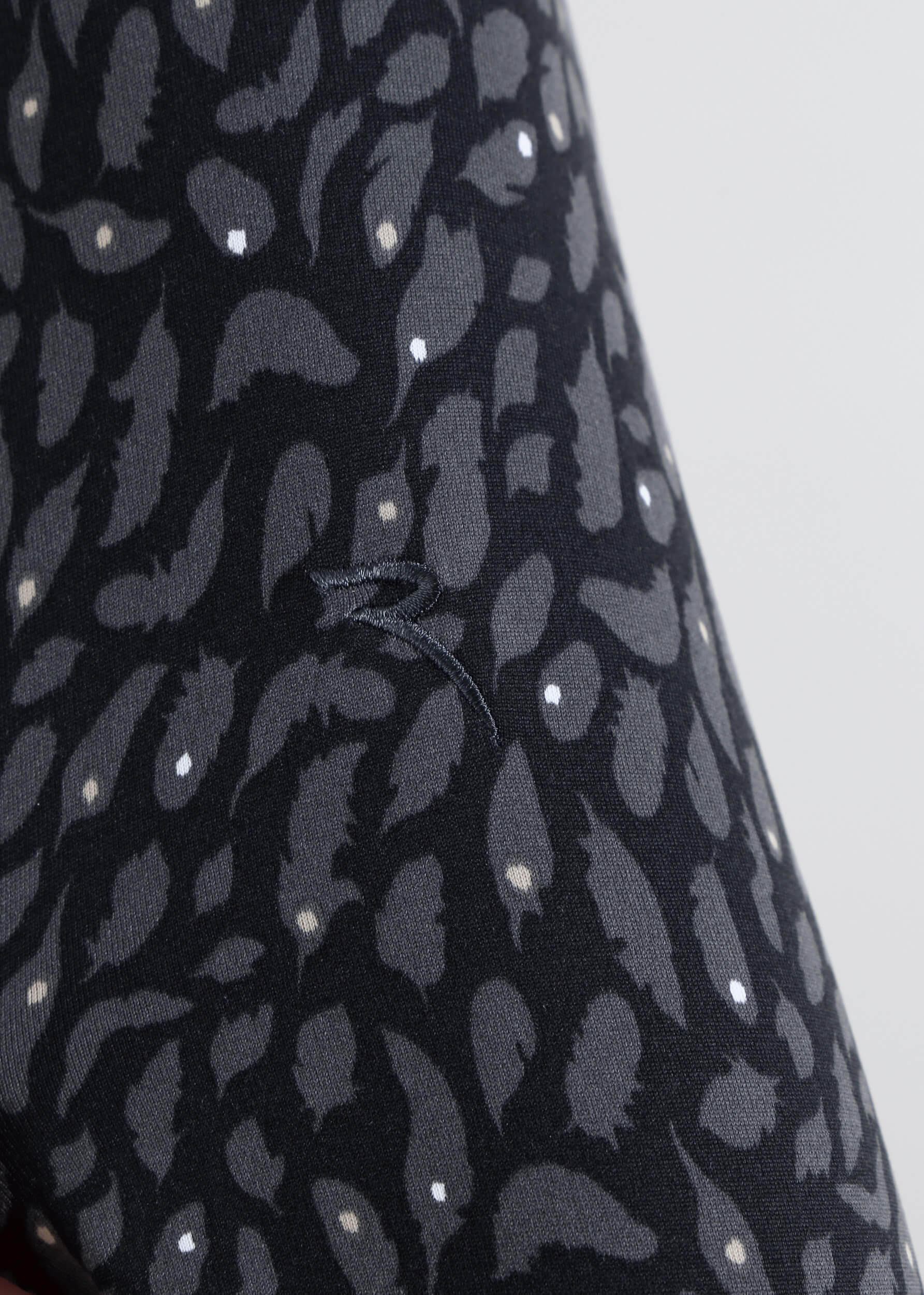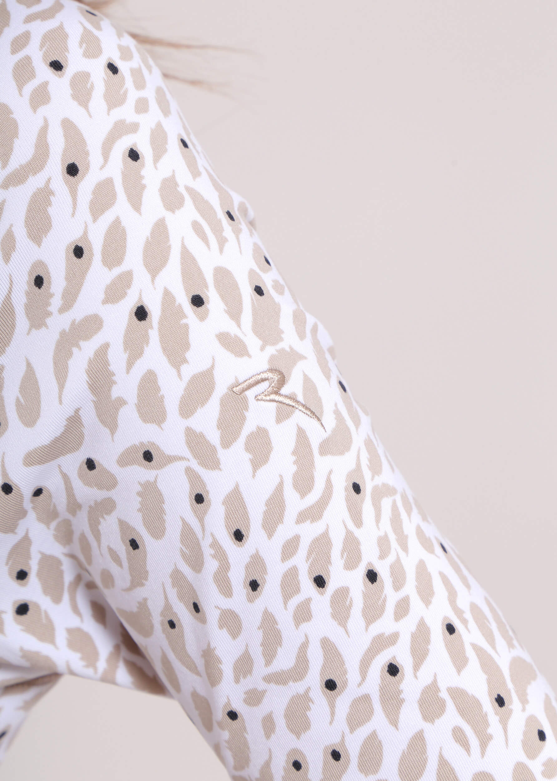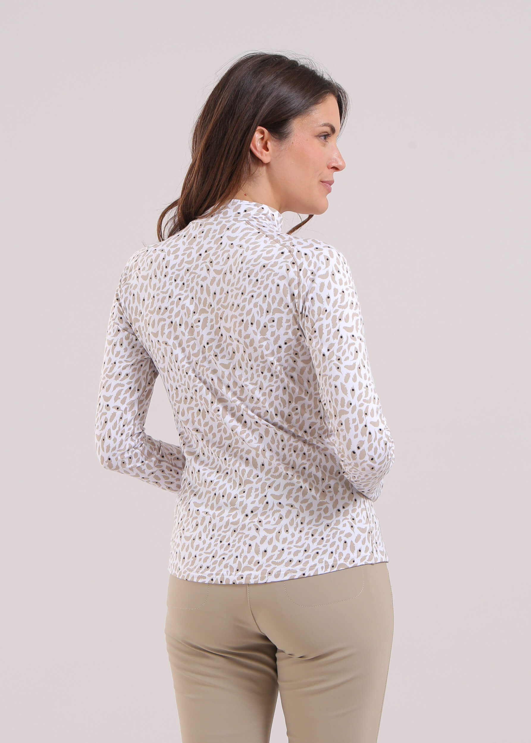 TANIA is a turtleneck sweater in brushed jersey, designed to be worn as a first layer. The all-over “Pois Feather” print adds a bold graphic touch. Stretchy and warm, it is the essential base layer to face the cold season with sporty style
