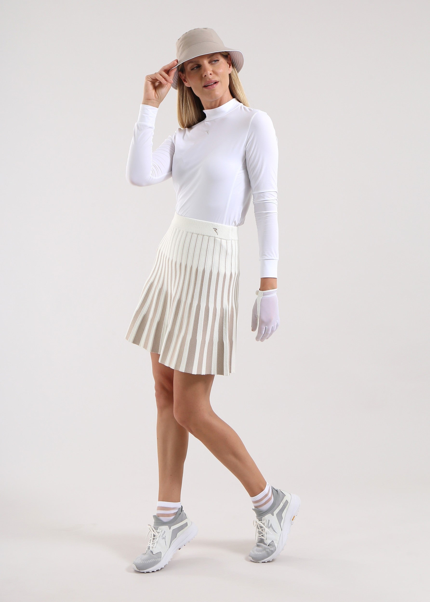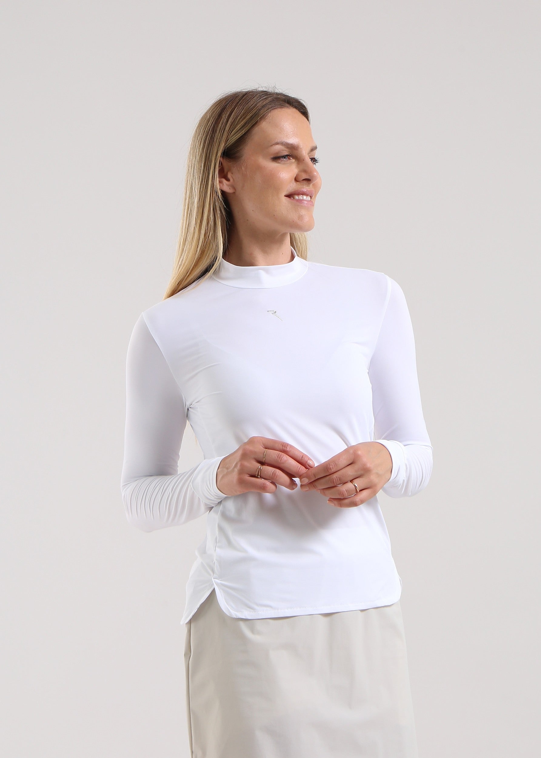 TRISTANA is an ultra-light women’s turtleneck designed to provide freshness and comfort on warmer days on the golf course, also ideal for layering. Made from silky, lightweight jersey with Dry-Matic® and Sunblock® technologies, it ensures effective moisture management and reliable UV protection. Extremely thin and comfortable against the skin, tailored pleats at the hem add a refined feminine touch. Lightweight and performance-driven, it’s ideal for play in warm conditions.